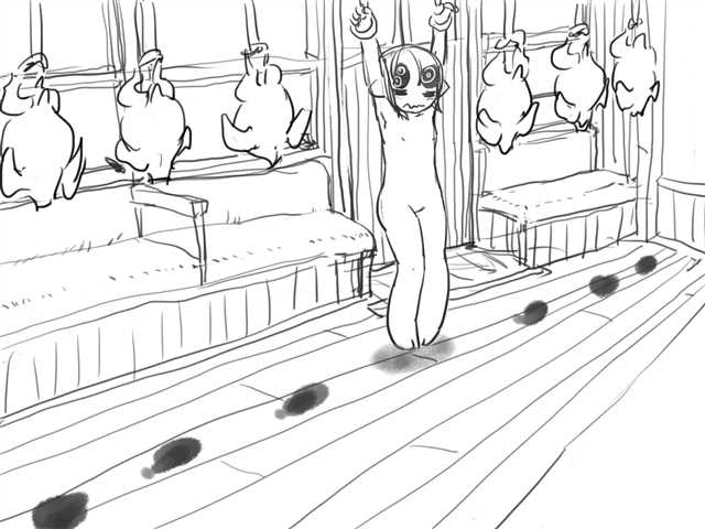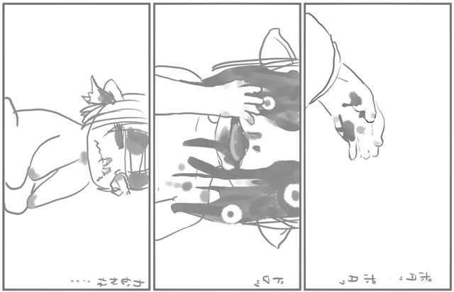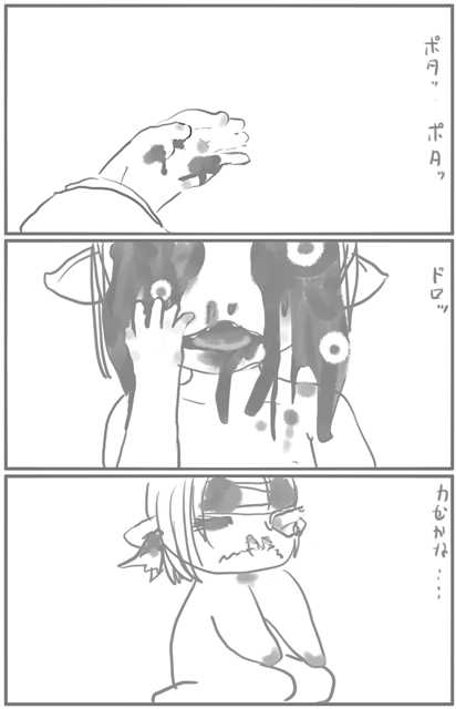 めがさめると れっしゃ つりかわにくびなしまるとり、ちぬきされている。あまだれのように ぽたりぽたり。つりかわから てがぬけない。
