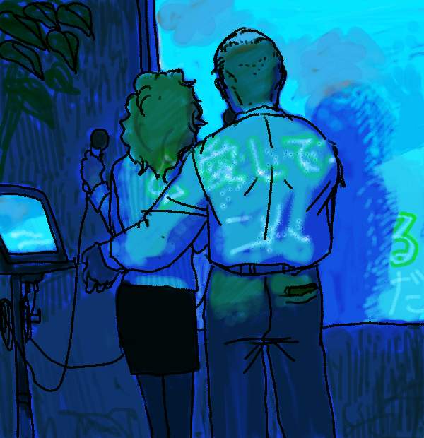 おねーちゃんと唄うおじさん。左手は腰を抱けるのでしょうか?