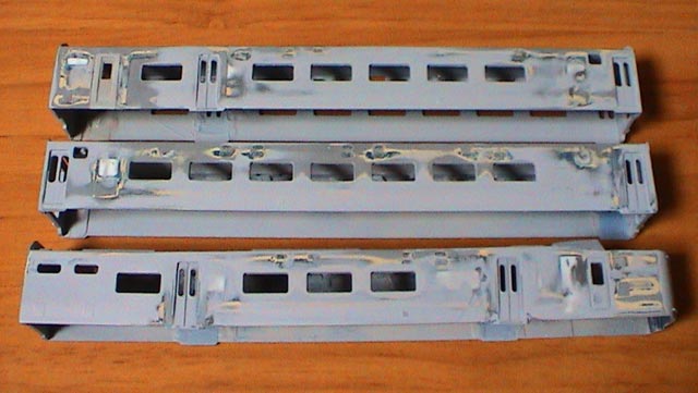 今のロットですよねぇ。 付随車側のモーターって抜かれてるんですか? 昔のロットは両方ともモーター入ってたから、小改造で2Mにできたらしい。 うちのクモヤは2M♪ >虫さん まだ開けてない窓ありますから。 これから乗務員ドアもつけなきゃだし、小窓もあけなきゃだし。 できるのはいったいいつの日か。 実車の車内は、キハ400並に暗いです。 >神崎川さん クリームはぜんぜん違いますねぇ。 色をあわすには調色するしかないです。 オレンジをかなり混ぜてあわしましたぁ。 傷埋めをやりやすくするために灰色は塗ってますぅ。 このまま修正を繰り返していって、最後に下塗りとして全部を灰色に塗って、その上に本塗装です。 だから落とすことはないです。 下地の色がある程度確定しないと、上の発色がばらばらになりますし。 |