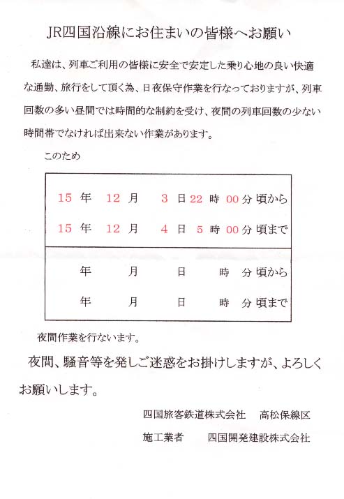 予讃線の軌道は結構厚い。。。 130キロ走行しますしねぇ。 発電機回して投光器たいてれば、明るくて写真撮りやすいですねぇ(違)。 |