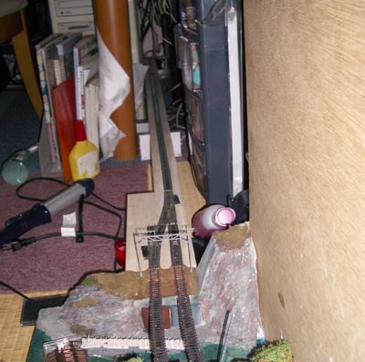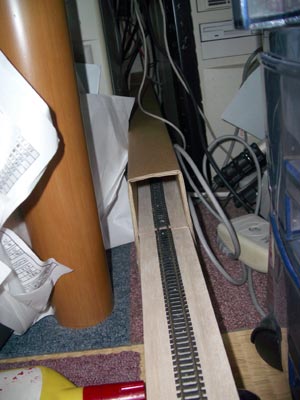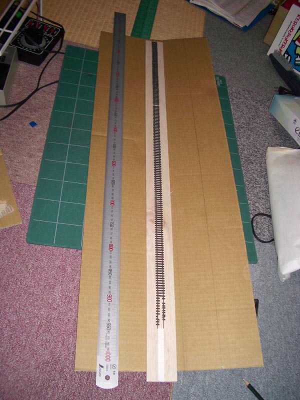 ジャンクのフレキを両面テープで……。 さすが仮設♪ 最大有効長は8両までみたいです。 これから補強を入れていくことに。。。 |