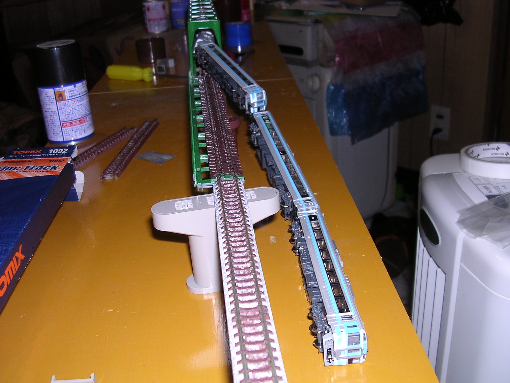 二部屋ぶち抜きのレイアウトが完成するとw 部屋に通過線,廊下でぐるっとまわすという 第三次プランは,高さの問題で断念しました。 あとは背景の山の中に隠すという常套手段かなぁ (川の土手に隠すという荒業も検討したけど…) |