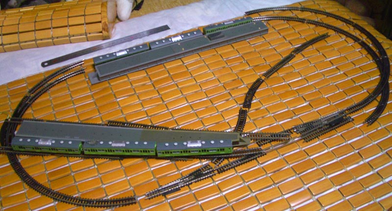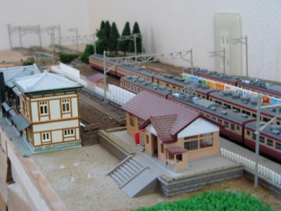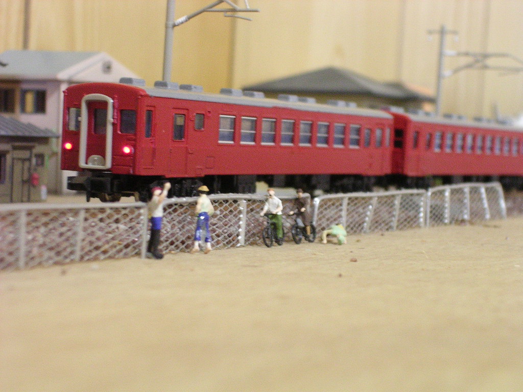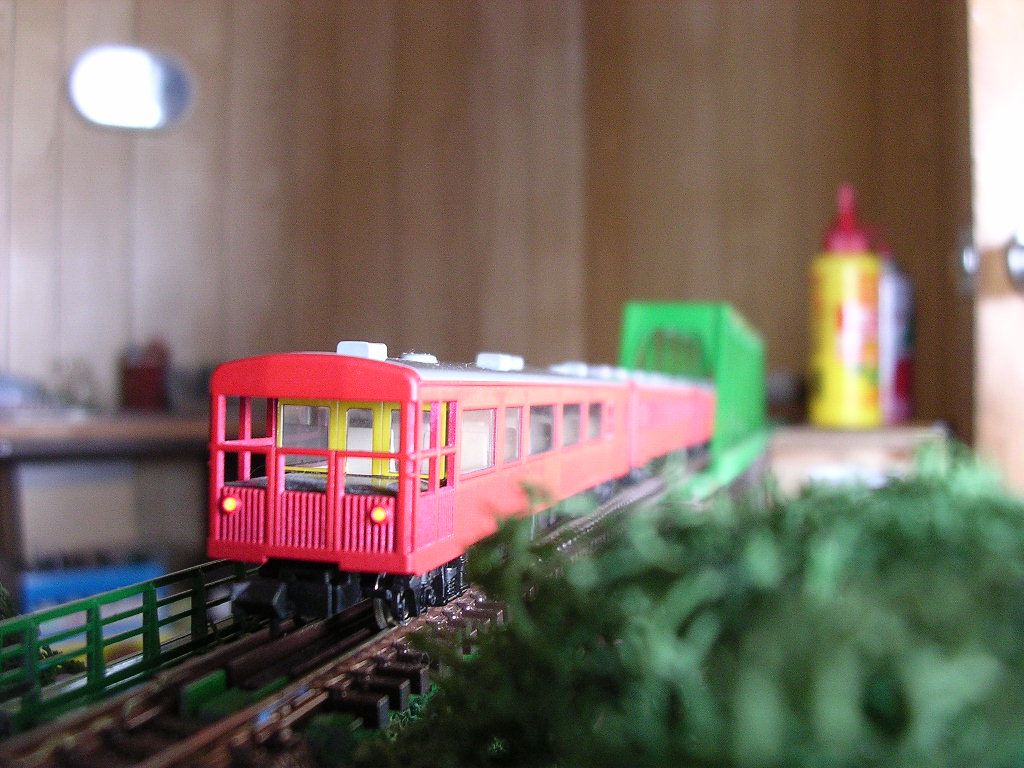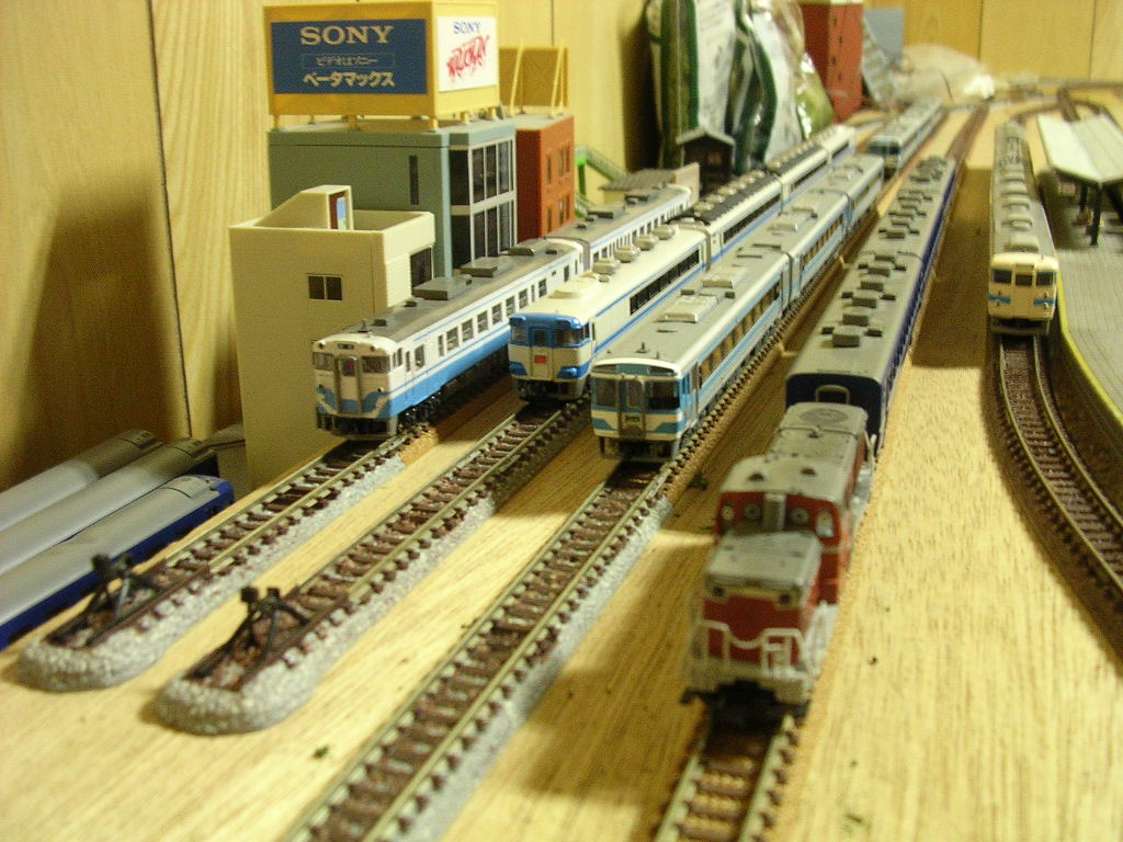 レイアウトじゃないんです。よめはんが実家に帰っている5日間くらいの間に100均で60×30の 板買ってきて、25年前に買った固定式線路ほかを適当に置いただけのものです。(KATOの側溝の蓋だけ今回 買ったものです。) 線路は5本並んでますが、実際に通電できるのは手前の1本のみですので、普段は改造(改悪)した車両 の乾燥用に使ってるだけです。実際の運転は台所のテーブルに小さなエンドレスをしくのが精一杯です(泣) (近い)将来はみゃあさんや、虫さんやあきさんらのレイアウトみたいなのつくりたいなあと思いながら、みな さんのHPをいつも見てます。 虫さんのレイアウト、楽しみにしてます。 |