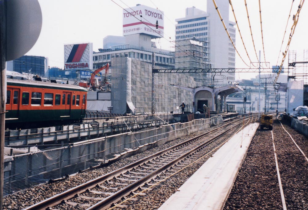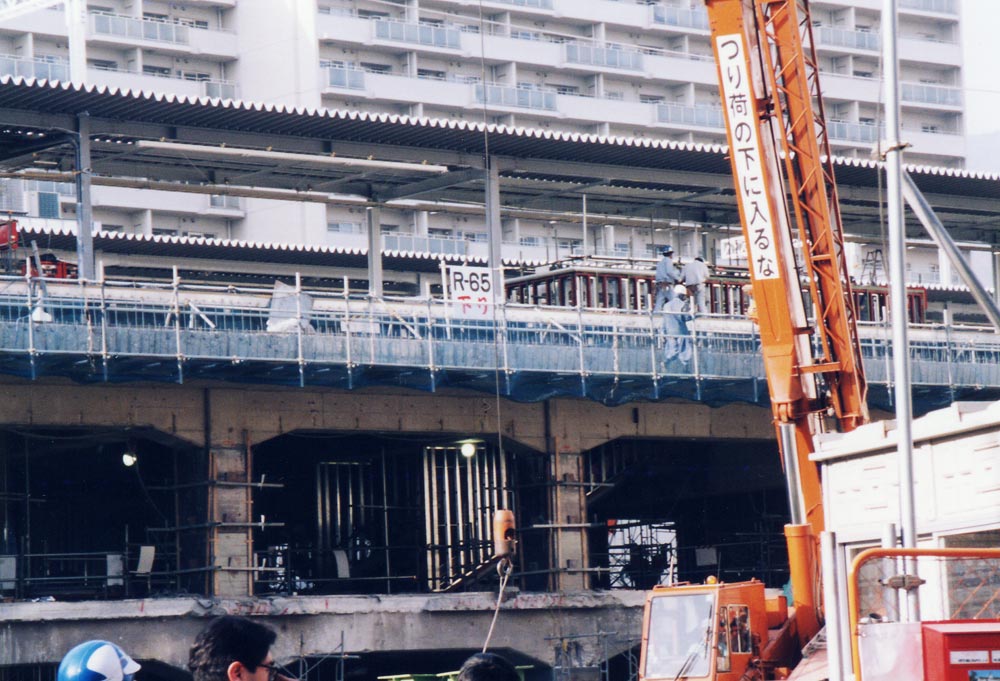 ちなみに見える上屋は、今の上り方階段。 ここのあいだが崩壊したので、とりあえず線路だけは仮設鋼で受けて復旧しながら運転。 ホームは下り方に延長して、最大12Bをさばいてました。 ちなみに撮影時は下り列車線が下り線、下り電車線が上り線でした。 つまり撮影位置は上り電車線の上になるらしいです。 |