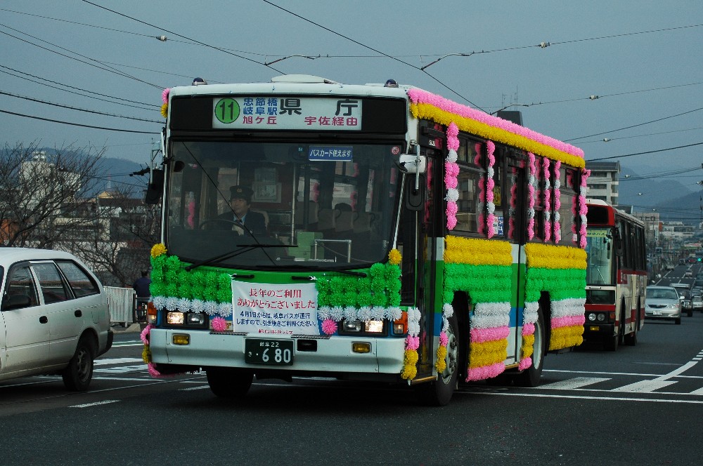 朝から結構人がいました(汗)小学生って早起きですね。 名鉄は特に特別な装飾はしないようで地味な最後です。 また昼から出撃予定… バスに詳しい方なら知ってるかな? 路面電車の影に隠れていますが実は岐阜市営バスも今日が最後。 グッズ等は売り出していないけど派手です。ちなみに乗るとパンフレット(ペーパークラフトつき)がもらえますよ。 |