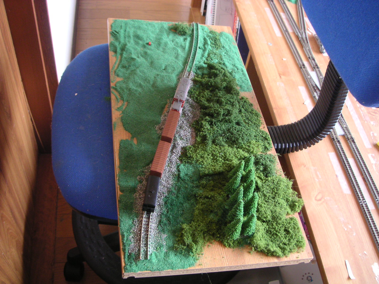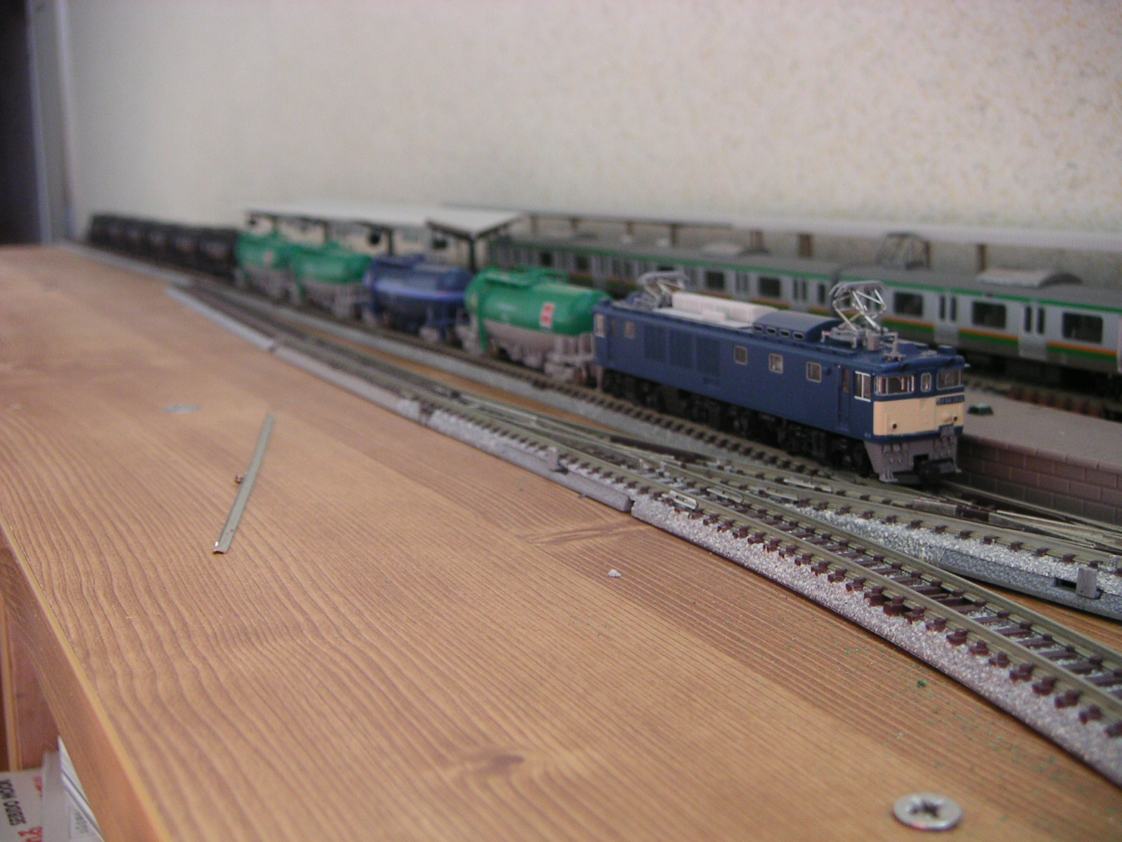 フレキはいいですよねぇ。 うちでもメインはフレキです。 都合によりユニトラックもあるので、つなぎ目はいっぱいありますけど、結構なんとかなるもんです。 あと、コルク道床は高いので3mm位の合板、無ければ2.5mm+厚紙でかさ上げすると安く済むらしいです。 昔はコルク使ってたんだけどなぁ。 幅も広めになっちゃうので、半分に割って使うのも手ですけどねぇ、コルク。 フレキの曲線区間継ぎには要注意♪。 瞬着……削り盛りを果てしなく繰り返してるからなんかすぐなのかなんなのかわからず使ってます(愚。 とりあえず今のところは……それほど引けてないですねぇ。 失った雨樋とかサッシとかの復帰によく使う人(愚。 |