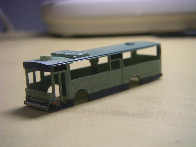 私も関鉄の気動車を想像しました。ラッシュ対応の近距離向け車両と設定しています。 窓を埋めた部分を一応トイレスペースにしています。 窓は下段の縦桟をカットして塗装しただけですのでタイプとなっています。 遠目から見たらこれでもいいかなぁ?と思いました。 自分もレイアウトを持てるようになったら、新京成バスなどをアクセサリー用 に製作してみたいです。製作頑張って下さい。 長文失礼しました。 |