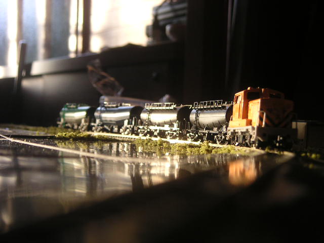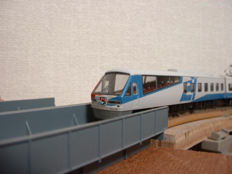 傾け方はいろいろ。最終的にバラストを蒔いて、見えなくなれば OK。爪楊枝でも、ビニール線でも。コルクシートでも。 でも「傾き度合い」は、製作者の判断しだいですから、不安でした。 カントを生かすには、緩いカーブが必須条件 のようです。 同じレイアウトのR282で45度のカーブにも、同じようにカントを入れて みましたが、あっさり通過するだけ。「車体傾いたままカーブを切って いく」ように見せるには、見せ場としてのカーブが小さすぎ。車体が 傾くやいなや、すぐにカント区間を通過してしまい、「傾いたまま」 の姿勢が、一瞬しか取れないようです。 |