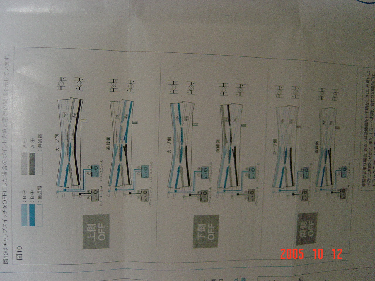 その時に、相手側の線路に電気が行くと、側線分岐がKATO手動だから非選択で2つのコントローラー両方からは遺伝してしまう危険ある予感。 ダブルスリップ説明書の一番右側の両OFFにして完全に分断するのが無難なような。 手動が混じってるから、外線・内線・引込1・引込2にそれぞれKATO 選択スイッチ(赤いやつ)で配線してやって、2つのコントローラーが選べるように…。 しまんとさんの案が一番無難なんですねぇ、実は。 なぜなら、複線の両側に安全に2本同時運転出来ますから。。。 |