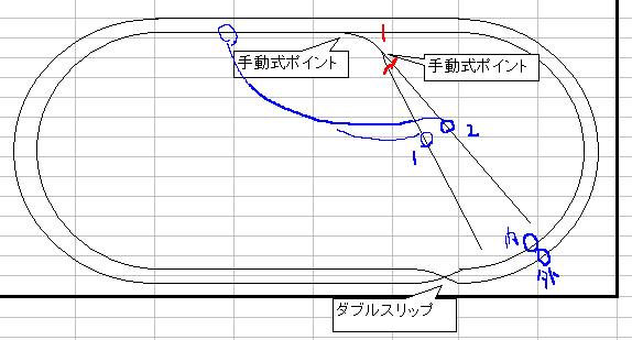とりあえず、初期プランのままでやってみましたぁ。 ダブルスリップは>>659の説明書の物だとすると、図面に対して上側に下が来るように配置して「上側OFF」の設定にしてくださいな。 さて詳細解説です。 赤い印が入っているところにギャップを切ります。 ちなみに内側線本線に入れるところは両ギャップで、留置線は左側だけの方ギャップにしてください。 青いところがフィーダーです。 内・外にはそれぞれコントローラーを直づけしてください。 内の左上部分は、下側のレールから電線を伸ばして、留置1・2にそれぞれKATOの選択スイッチ(緑)を介して接続します。 もしくは、KATOの選択スイッチ(赤)を利用して、A側を留置1、B側を留置2でも良いかと。 運転は通常はそれぞれのコントローラーで、内から留置にはいる時は入りたい方のスイッチをオンにしてください。 外から留置にはいる時は、内の列車を右のカーブの部分に止めて、ダブルスリップを切替。 外のコントローラーで留置に入れます。 たぶん。。。 |