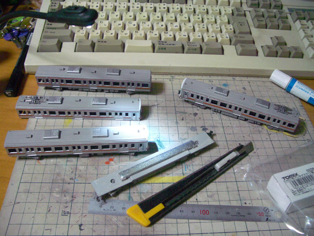 こないだまで1M1Tの6000番台2編成だったのを、Tcの屋根+E127-100作成時にあまった側板x2でMにして 5000番台x1+Mcなんて言うことにしたらしいです。 3両組みを少し増やしたかったもので…。 実は5000番台キットは買ったこと無いんですよねぇ。 6000番台は7箱くらい買ってるだろうけれど…。 側板だけ買ったのあわせたらもっといっぱい。。。 211のTcって、結構それっぽい色々作るのに便利なんです。 このライトは距離とか角度が自由自在なので、結構いいですよぉ。 398円だったし。。。 |