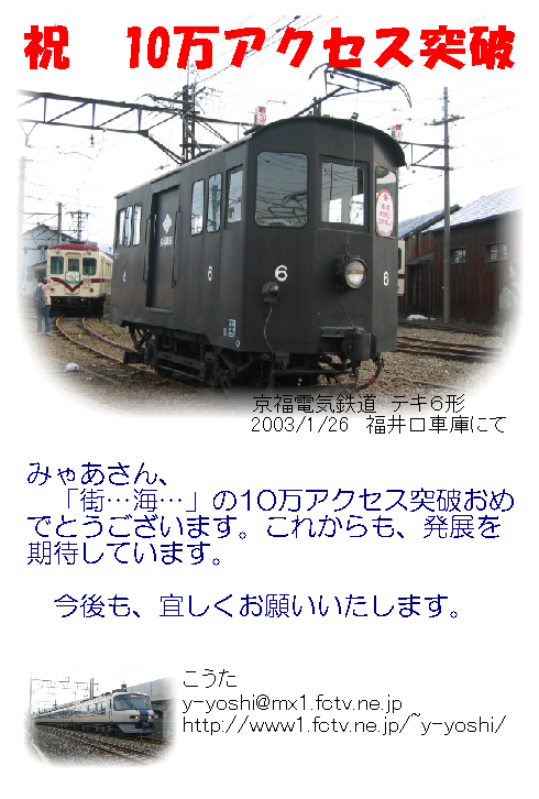 カウンターは必須でないですもんねぇ。 某知り合いのところは、カウンターが2進数でついていたり(謎。 今のサーバーにうつってからの全ログあるので、ページビューも出せないこともないんですけど、出したこと無いなぁ。 立ち上げた時……無かったですから、鉄道系はほとんど。 1997年だったはず。。。 でもそのおかげで、Y!にも簡単に登録してもらったし☆。 その後カウントアップ目的に、某ならばさんとこでしばらく色々書き込んでいた時期も(謎。 |