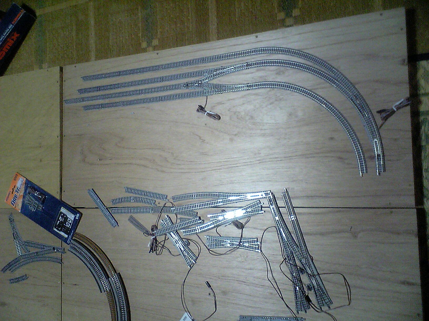 携帯電話のカメラなので。画像が不鮮明なこと、 お詫びします。 レイアウトサイズは、650×500(木炭画パネル 画材屋さんで750円/1枚ぐらい)4枚を「逆L字」 形に配置。配線はループ形で、手前の2線は つながっています。電気的には絶縁してます。 |