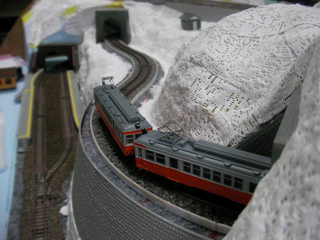 私はなかなか出歩けない(出歩かない)のでGooglEearthでプチ旅行してます。 とりあえず今作っている箱根登山鉄道をたどってみました。なかなか面白いです。 で、レイアウトのほうはこんな状況です。 基礎は出来たのでこれから情景の作りこみです。 真っ白い山を降りていく車両をパチリ。 |