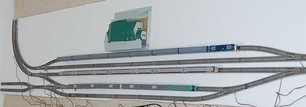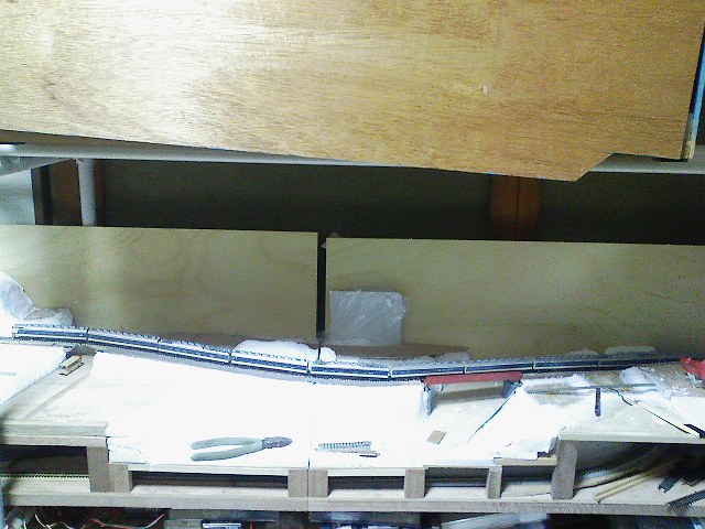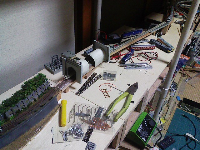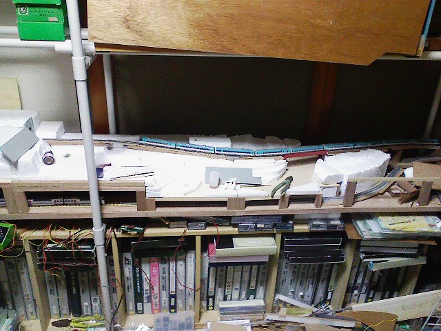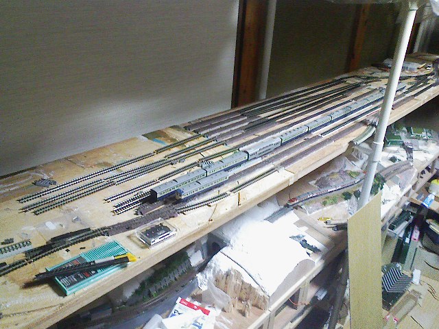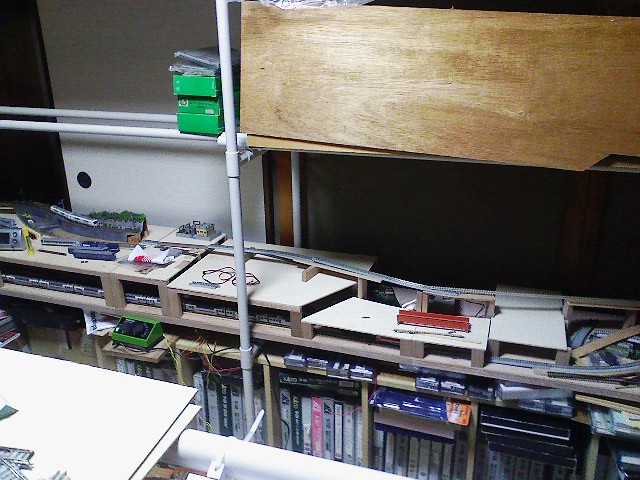 既存のスイッチバック下ヤードにも設置が完了。 残りは未工事の上層レイアウト部分に設置予定で、あと10個ほどスイッチが用意してあります。 その作業の結果、下層上段(わかりにくい)のボードの仮設が全区間で可能になり、横から見るとだいぶイメージがつかめるように。 右の一段下がっているプレートガーターが置いてあるあたりが川になる予定です。 で、左の海モジュールのすぐ右横がトンネルでシーン転換、海面高度が一気に変わる予定ですよ。 |