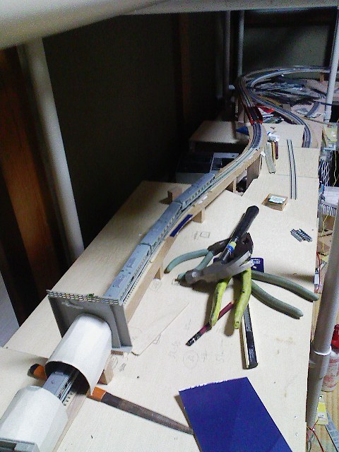 やっとこのカーブのレールが引けましたよ。 あとは奥のプレートガーターの手前だけ。 今週末にはなんとかなりそうですね☆。 そして仮設折り返しカーブ部分の工事に…。 これが出来ればついに1周できるようになりますよ! |