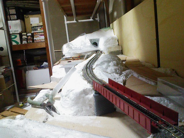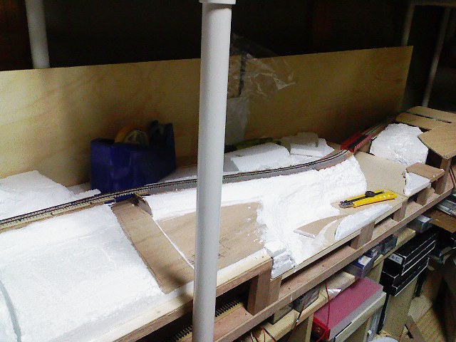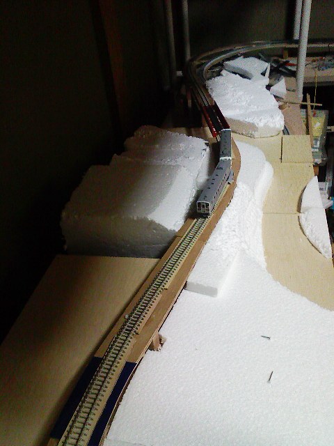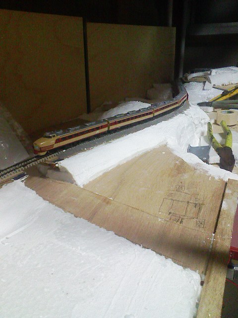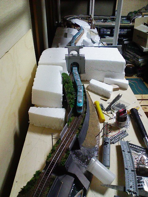今まで貯めてた、いろいろな物についてきた発泡スチロールが消費されつつ。。。。 今回の1期工事でほとんど使い切っていいんですよねぇ。 2期工事は重量制限がないから、石膏主体になるだろうから。。。 川のコースは決まったけれど、道やトンネルまわりが未決定らしいです。。。 |