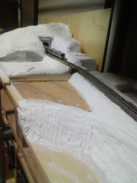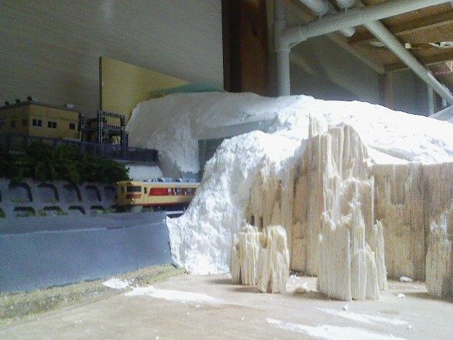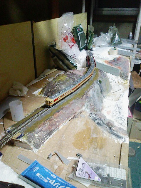 さて、石膏作業が開始みたいです。 とりあえずは下塗り。。。 川に落ちる崖は、このあと岩場になる予定? |