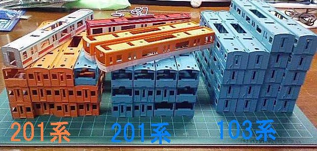 ウチは鉄コレのぞいたら50両くらいしかいないような? 最近は釜が増えているので数が増えていないみたいです。 GM大須ジャンク市での戦利品。 念願の103系中間が手に入ったので、ちまちまと部品揃えて103系を作ろうかと。 ついでに201系も増えちゃいましたが。 |