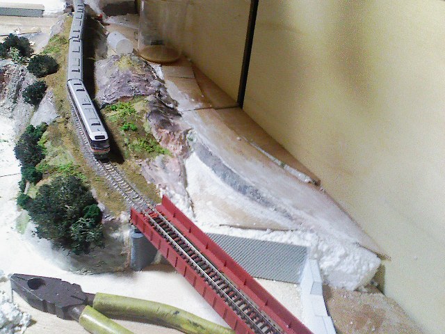 今回は、まだ塗装もパウダーも施工中の川沿いの崖の写真です。 最近は工事進められなかった分、上層とか2期工事部分とかの設計が完了してきました。 なんだかこの区間、下層全域は将来的には20mを越える行き止まり線になる事になりそうです。 エンドレス運転は上層に任せて、コンピュータ支援の自動運転も基本仕様がまとまったので、まったり楽しむ路線にしようかと。。。 鉄コレのこれ、ガラスも取られてるんでしょーか? |
