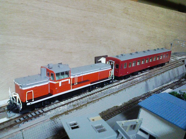 わっちがここにもおるz(ry さりげなく入れ替え用DE10とか停まってると更に萌えます。 そんでもって増結用のキハ58とか停まってると鼻血が吹きd(ry 広いレイアウトの中にこういうアクセントがあると魅力がぐっとあがりますよね。 やっぱりその辺はセンスってものが重要なのだと最近気づきました。 |