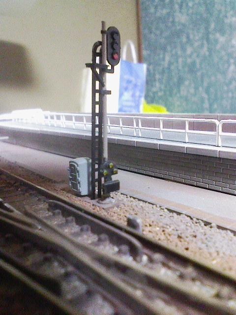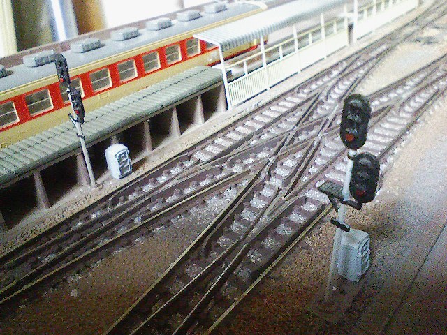 剥げたらまた塗ればって感で。 そのあと汚しでアクリル系塗ってますけど。。 路面はあとでやするので、全く気にせず。。。 青信号にすると、それはそれでー。 閉塞信号だけ青にするのも手ですね☆ |
