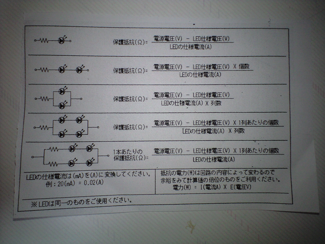 建物用の照明なら抵抗でも行けますよー。 5V加圧として、明るめで行くなら75Ω、そこそこいい感に押さえるなら240-480Ωくらいのぶら下げておけば。 1/4Wのよくある奴なら安いですし、日本橋の千石で5円/本 100円/100本です。 >373系さん えーっと…… 逆電流でも電圧が高いとやっちゃうことあるのでご注意くださいっ。 |