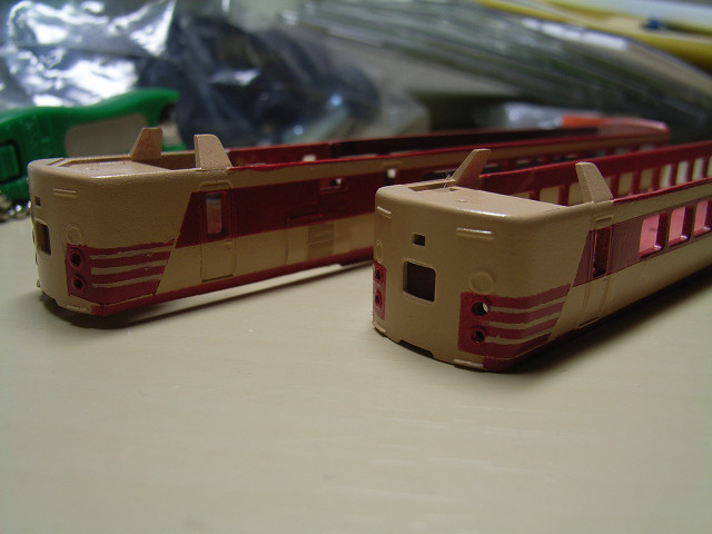 以前、虫さんのところに載せましたクモハ485-0の進展状況を・・・。 昨年8月以降放置しておりましたが、引っ越しと同時に製作再開しました。 といってもルーバー取り付けと塗装を残すのみでしたが・・・。 まあ、ご覧のような感じです。塗装順番のセオリーからは逸脱しておりますが、それクリームの発色を重視したゆえに。 残すは雨樋と国鉄色最難関と思われる髭です。 さて、成功した画像を載せれるよう、また塗装にいそしみます@ふろば 携帯から失礼しました。 |