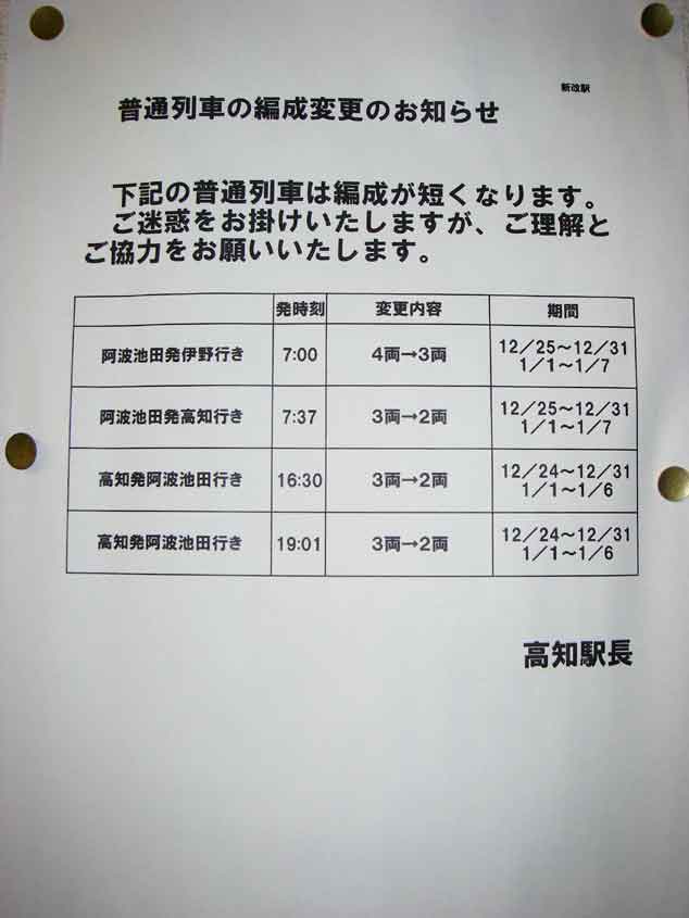 http://www.jr-shikoku.co.jp/03_news/press/07-12-25/04.htm 【列車の部分運休区間と代行輸送】 ○ 2月25日(月) ・下り 南風27号 高知行き(岡山 21:22発) 部分運休区間:土佐一宮駅〜高知駅 代行輸送 :大型バス(土佐一宮駅でお客様が乗換え後に発車) ○ 2月26日(火) ・上り 普通列車 土佐山田行き(高知 5:27発) 部分運休区間:高知駅〜薊野駅 代行輸送 :ジャンボタクシー(高知駅を5時17分に発車) ・下り 普通列車 窪川行き(高知 5:50発) 部分運休区間:高知駅〜旭駅 代行輸送 :ジャンボタクシー(高知駅を5時40分に発車) (入明駅を5時46分に発車) (円行寺口駅を5時48分に発車) 朝一の上りは、山田行き回送だけどな〜(謎) 29日期限の再発見2回分...減車58でも撮っておくとするか |