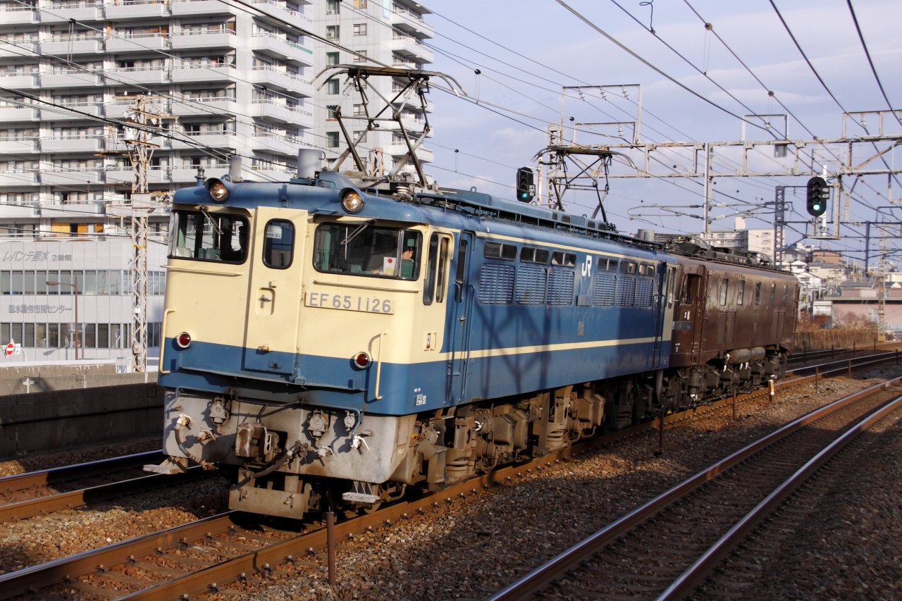 EF65-1126+EF58-150(ムド) 下関車両センター入場による配給列車。 垂水駅にて。 縮小時の解像度をあげてみましたー。 |