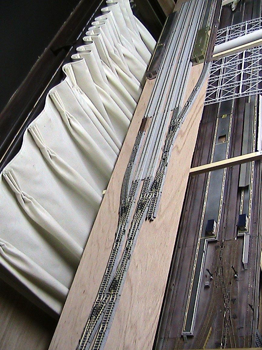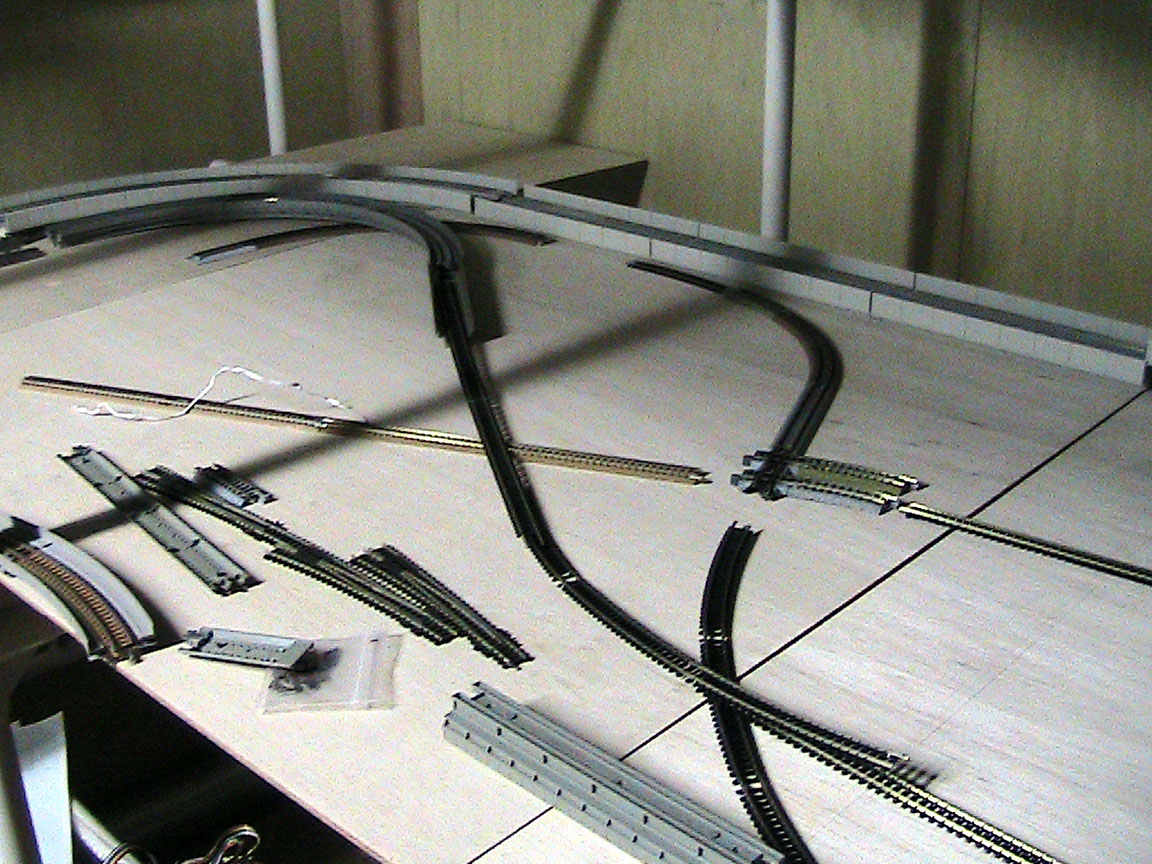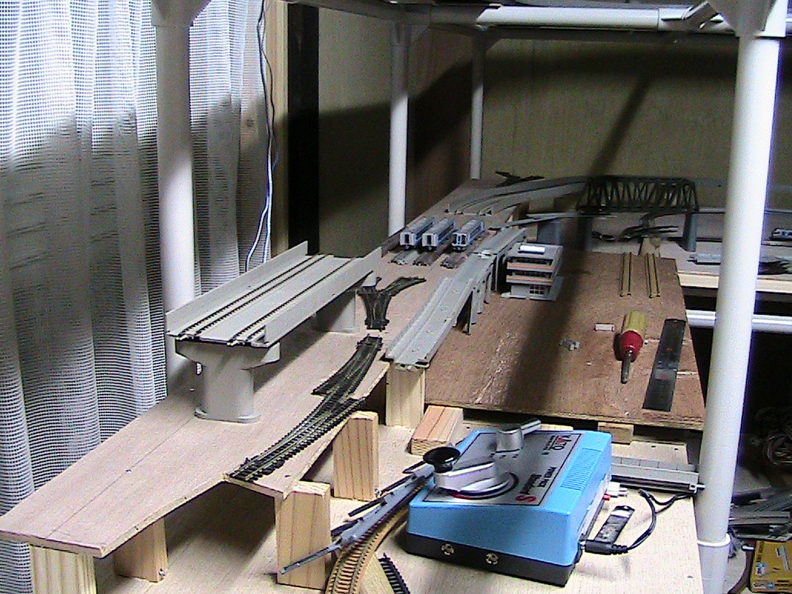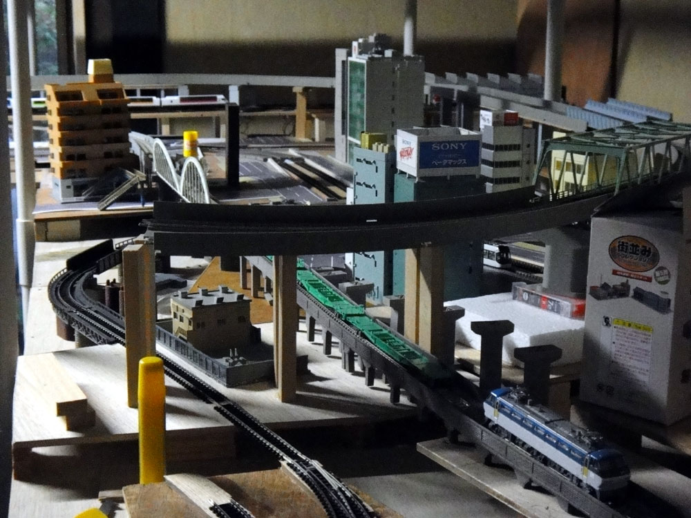 要調整。。。 別で進んでいる下層の通路を渡る鉄橋アプローチ部。 481右→100ストレート→381左→249左のS字です。 ここは2000や8000が映えそうだなぁ。 手間も481でここは90度ターンします。 |