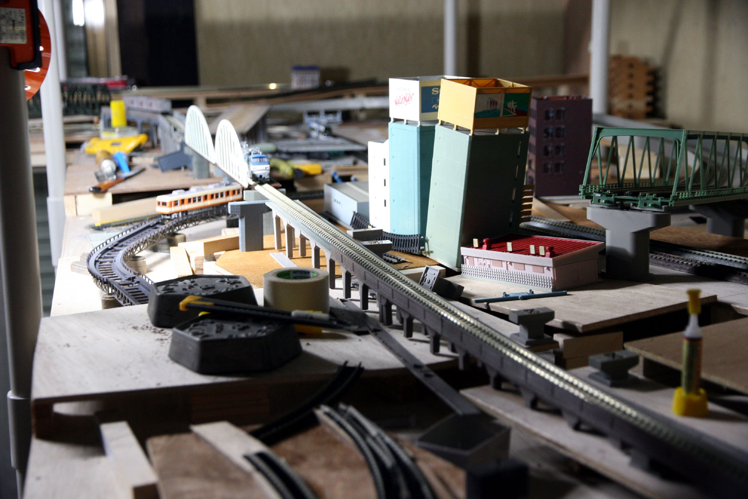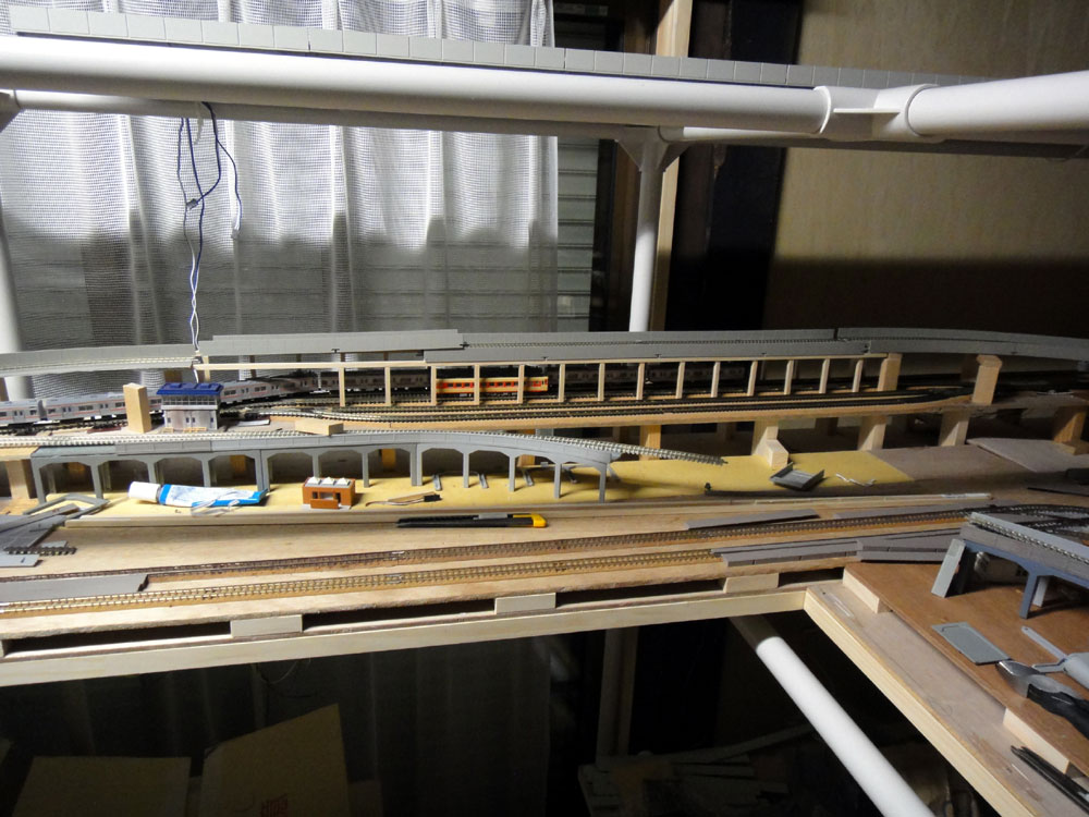 これが地味に時間かかるんですよね orz 敷設が終わった区間しか塗れないし。 この部分は2層高架なので、あとで塗りにくくなる分先に施工中。 同時に高架橋脚の目止め下塗りも開催中? |