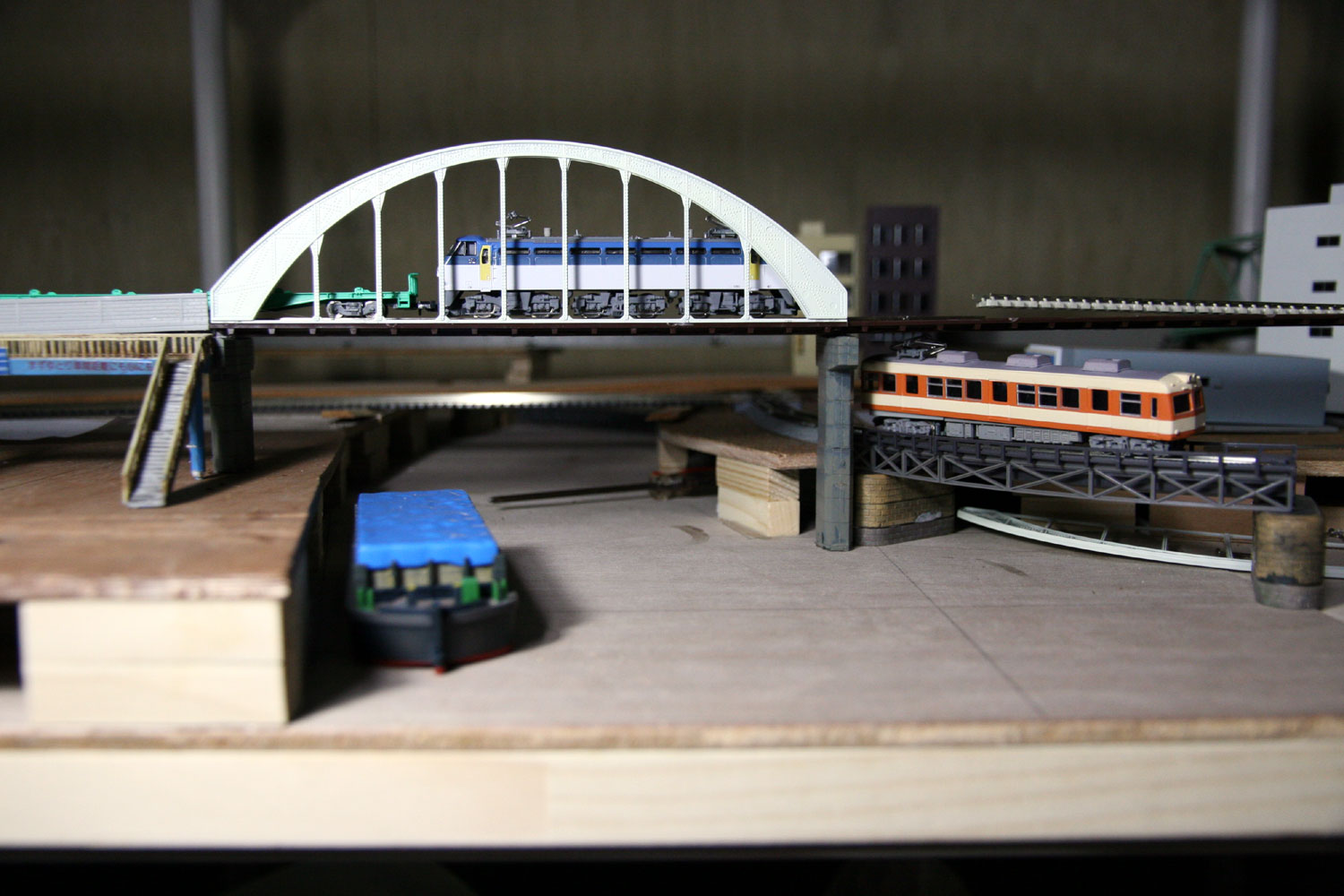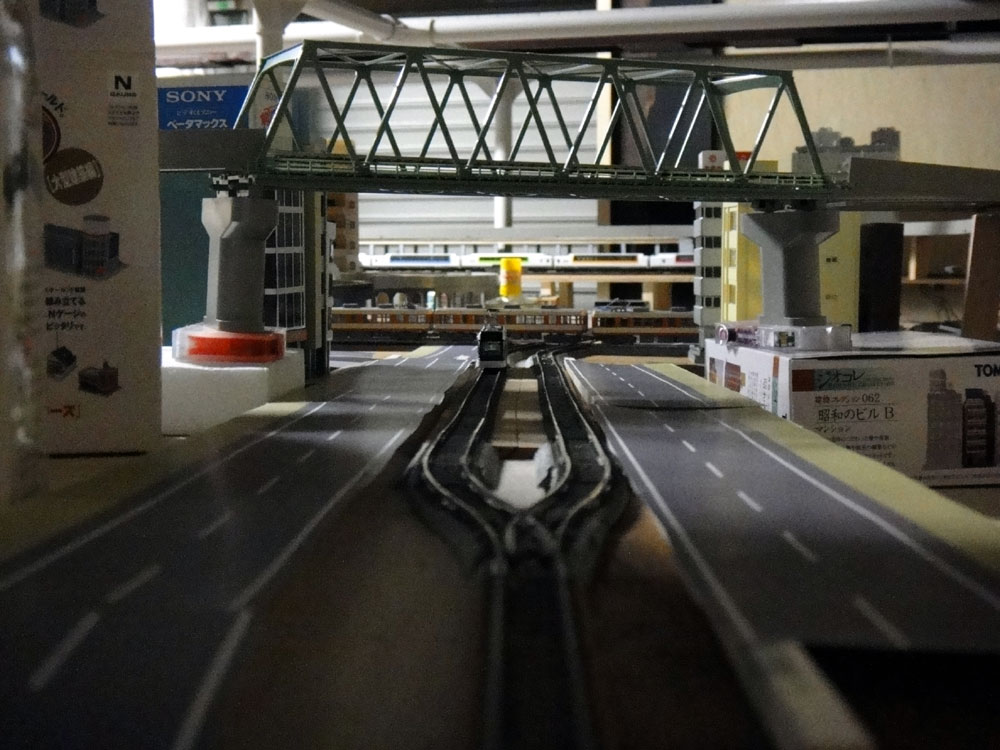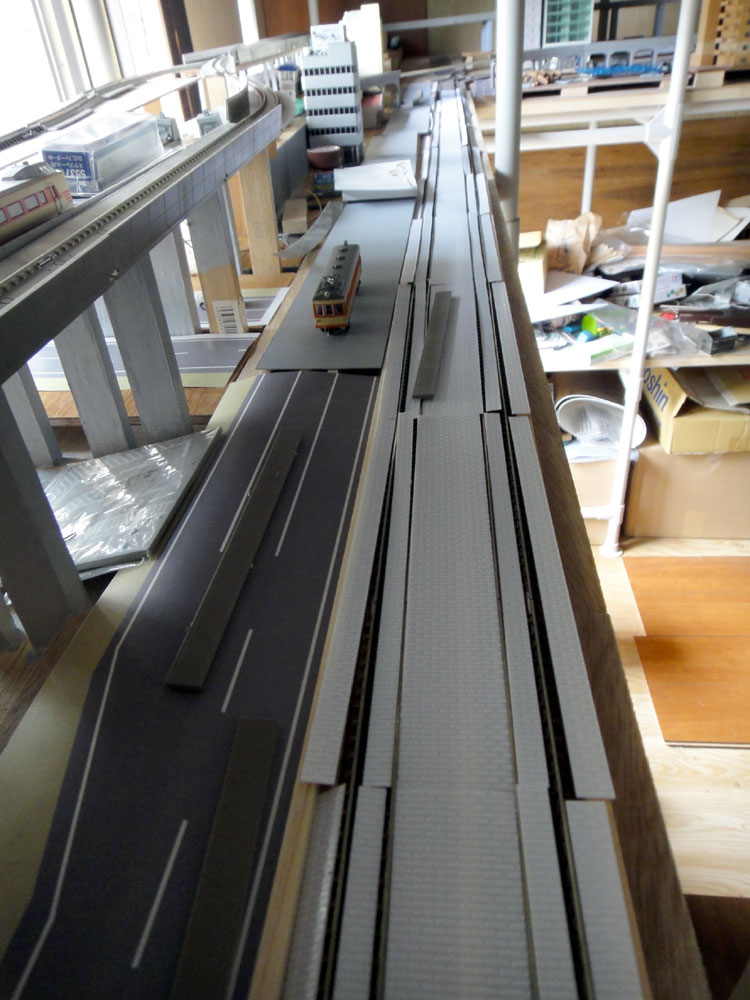 KATOのより複線間隔広い分、狭く使う気ならマージンあるのよね。 スパンも長くとれるし、これで一気に4車線道路+路面軌道をまたぐよ! |