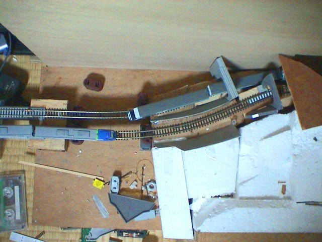 架線柱 立てる前で良かったです。ほんとに。 ってか、こんなところにポイント、実際はつかないんだけどねぇ。ポイント、このまえの解体で不要になったからここに使ってたんです。 そしたら、事故・・・ でも、一応大丈夫な感です。 |