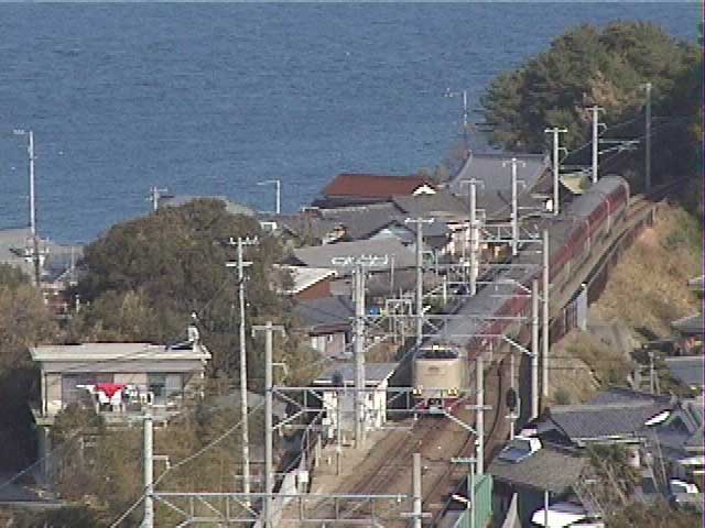 撮影ポイント、大浦駅上。 駅から農道を延々歩いてみかん山っ。 もっと引いて、海いっぱいでもいいかも。 実は通過後、足下のトンネルを抜けた裏側も撮れるっぽい♪ (冬限定?) |