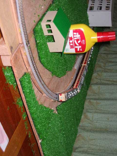 この付近は、架線柱を立てて、土盛りの土台を紙粘土で作って、ターフとバラストをまいて、あぜ道の処理をして砂利道を作るだけです。