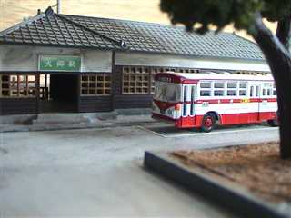 スイッチバックの駅と停車中のバス。