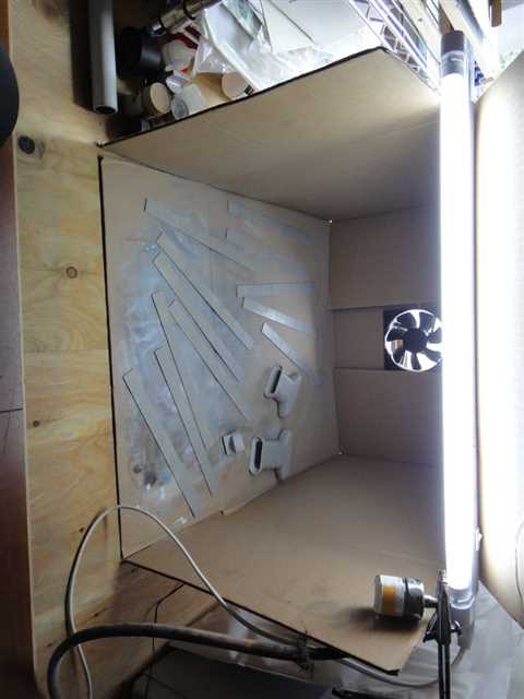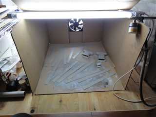 今まで段ボールだけだったんですが、廃物利用の12cmファンをコントローラーに繋いで排気するようにしました。