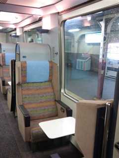 前から2両目 平日天王寺場面 発車8分前で半分以上空き。